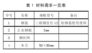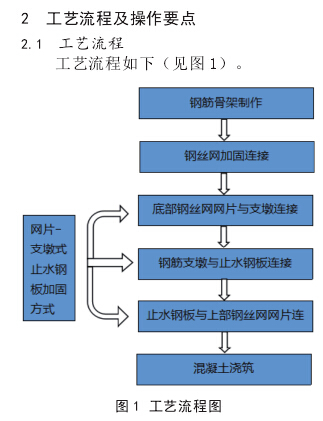 <3)網片一支墩式比水鋼板加固方式。①底層鋼筋綁扎完成后,拉通長線,將制作完成的鋼筋網片與底筋焊接,保證順直,并用短鋼筋焊接做斜撐加固。②將比水鋼板凹槽沖向迎水面固定在鋼筋網片上部,保證鋼筋網片始終在比水鋼板中心線上。③比水鋼板支設:利用鋼筋支墩加固卜部鋼絲網片,支撐比水鋼板,利用比水鋼板支撐上部鋼絲網片。④將比水鋼板上部的鋼筋網片固定在比水鋼板中心線上,后焊接短鋼筋做斜撐加固,鋪設上層鋼筋。