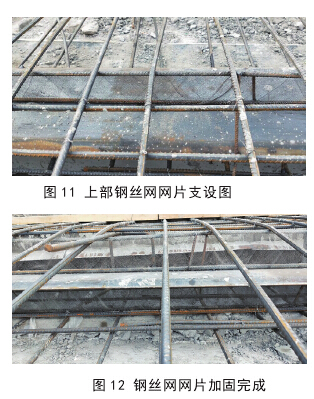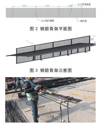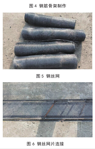 <2)鋼絲網加固連接。利用鋼筋骨架加固鋼絲網,從鋼筋骨架一端開始纏裹鋼絲網,直至另一端結束后使用扎絲綁扎牢固,形成鋼絲網片(見圖5、圖6) 。