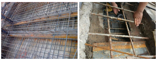 底板鋼筋安裝完畢以后就進行止水鋼板等工序的施工,事先預制一定高度的混凝上支座(與結構混凝上標號一致),下端為混凝上墊塊上端預埋短鋼筋作為固定止水鋼板的焊點。在底部鋼筋綁扎好之后將止水鋼板支座的混凝上端綁扎固定在底板鋼筋上。支座安放間距視實際情況而定以保證能固定止水鋼板即可,固定好支座后在支座上沿止水鋼板方向綁扎密目鋼絲網作為止水鋼板下部混凝上斷開的設置,隨后焊接止水鋼板,在合適的位置焊接鋼筋樁用于綁扎密目鋼絲網,鋼筋樁應該與上部鋼筋等高。最后綁扎上部鋼筋,在上部鋼筋面以上混凝上斷開處綁扎與鋼筋保護層等高的木方條。