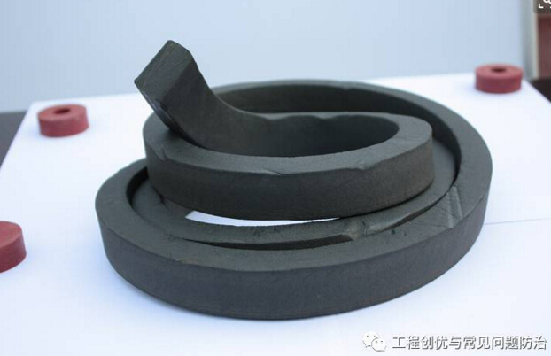 3、缺點:混凝土中有許多尖角的石子和銳利的鋼筋頭,因為塑料和橡膠的撕裂強度比拉伸強低3~5倍,止水帶一旦被刺破或撕裂時,不需很大外力,裂口就會擴大,所以在止水帶定位和混凝土澆搗過程中,應注意定位方法和澆搗壓力,以免止水帶被刺破,影響止水效果。