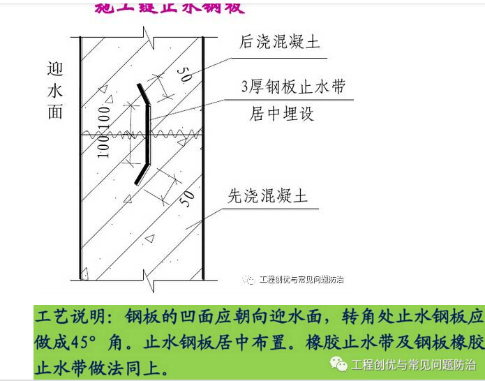 新舊混凝土接縫位置稱為施工縫,此屬于防水混凝土防水的薄弱環節,增加止水鋼板后,水沿著新舊混凝土接茬位置的縫隙滲透時碰見止水鋼板即無法再往里滲,止水鋼板起到了切斷水滲透路徑的作用。