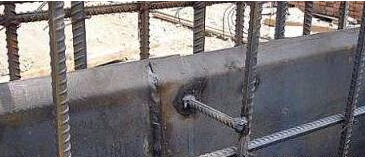 止水鋼板穿過柱箍筋時,可以將所穿過的箍筋斷開,制作成開口箍,電焊在鋼板上。